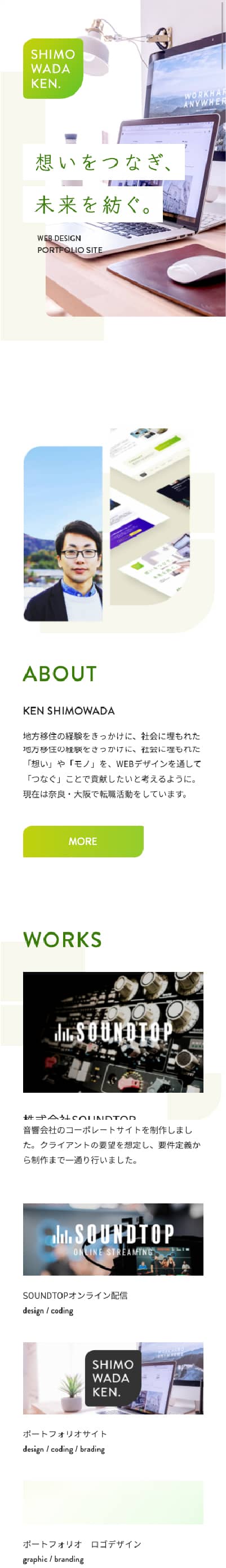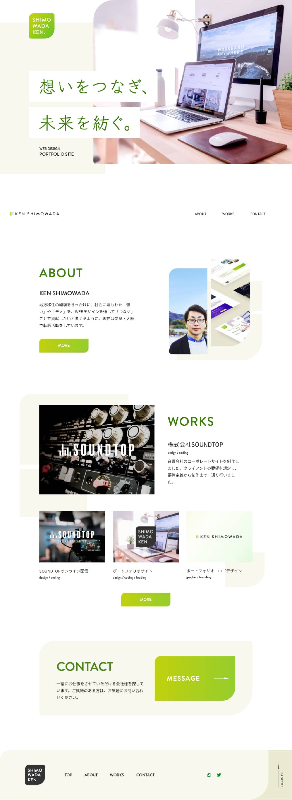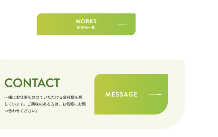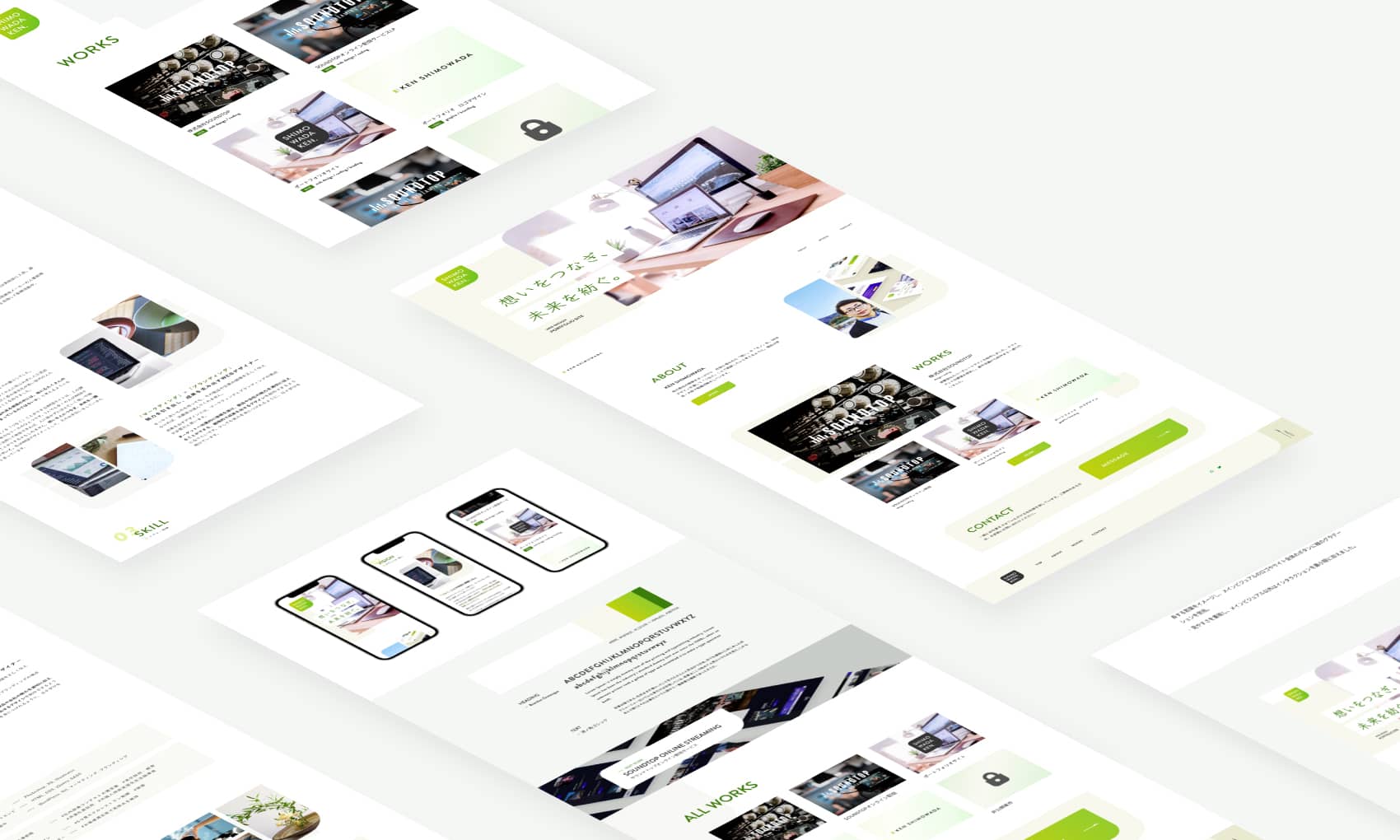ロゴに使用した明るい緑を基調に、全体の配色を同系色で配色。初心を忘れず日々成長していきたいという想いを込めて、太陽の日を浴びて成長する若葉をイメージした黄色と緑のグラデーションをアクセントに使用しました。